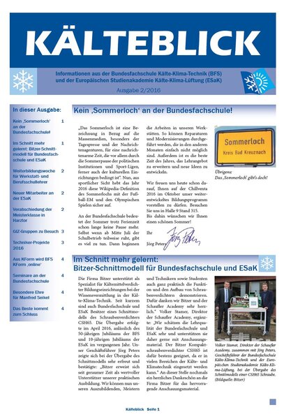 Mit der zweiten Ausgabe des Kälteblick für das Jahr 2016 möchten wir Sie wieder über Neuigkeiten aus Bundesfachschule Kälte-Klima-Technik und ESaK informieren.